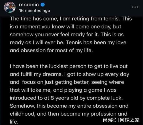 北京時間今晨,加拿大名將米洛斯-拉奧尼奇在個人社交媒體上發文,宣布結束自己的網球生涯正式退役。35歲的拉奧尼奇有“加拿大火炮”、“拉神”之稱,曾在2016年打進溫網決賽收獲亞軍,創造了加拿大男網的歷史,最高世界排名來到過第三位,獲得過92場大滿貫的勝利,在90后球員中僅次于小茲維列夫和迪米特洛夫。過去幾個賽季,拉奧尼奇始終受傷病困擾,偶有復出也是以失利告終。如今看來,他的傷病已經到了非常嚴重的程度,無法再支撐他征戰職業賽場了。再見了拉神!祝他退役之后的生活一切都好!